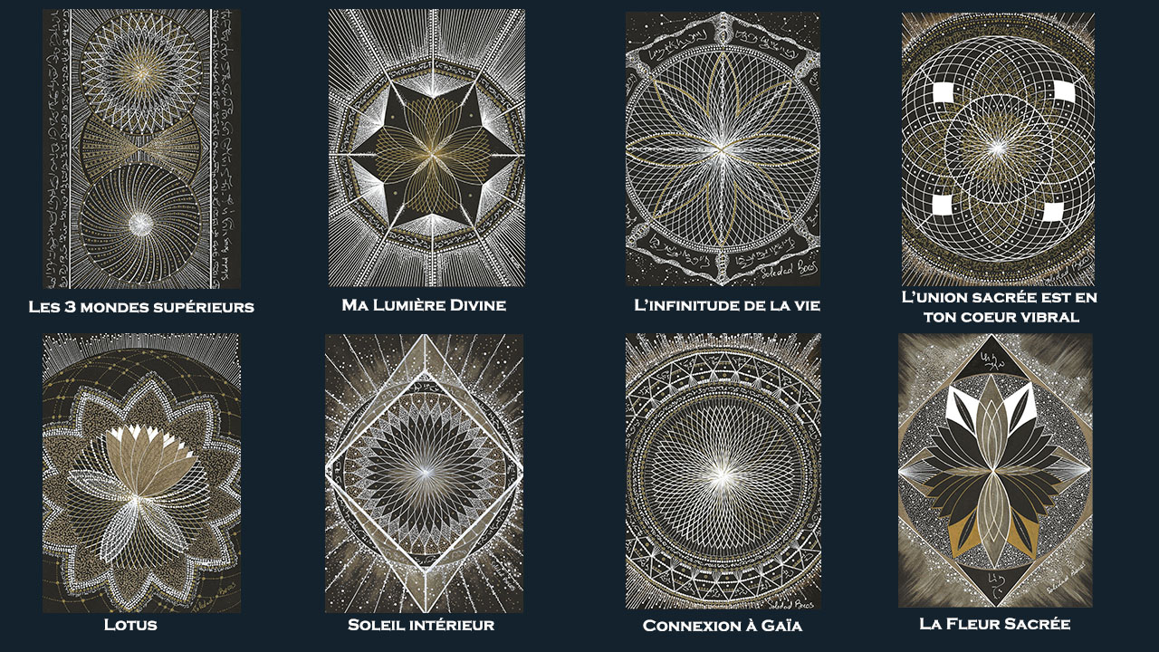 Les œuvres vibratoires Connexion à Gaïa, La fleur sacrée, le Lotus Divin, Les 3 mondes supérieurs, L’infinitude de la vie, L’union Sacrée est en ton coeur vibral, Ma Lumière Divine, Soleil intérieur, sont en lien avec l’incarnation et les reconnexions à faire pour mieux la vivre.